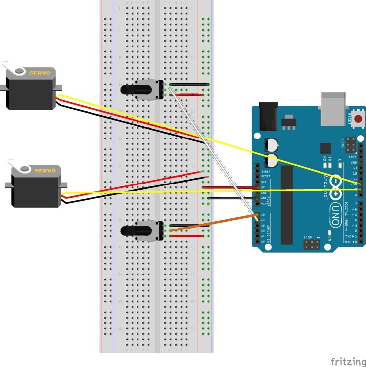 - 아래 코드를 기반으로 loop() 함수의 내용을 코딩하여 2개의 서보모터를 2개의 포텐셜미터로 제어하는 동작을 구현하시오.