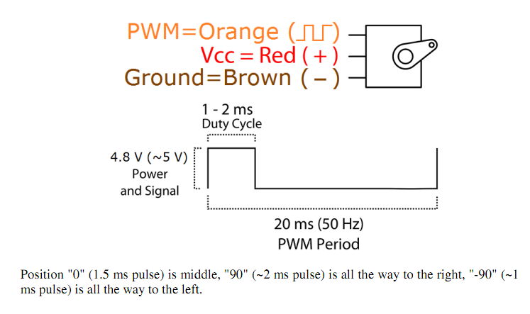 - 오렌지 핀은 데이터 핀으로서 20ms(0.02초) 동안 1과 0의 신호 비율을 통해 내가 원하는 서보모터의 각도 값으로 제어 할수 있다.