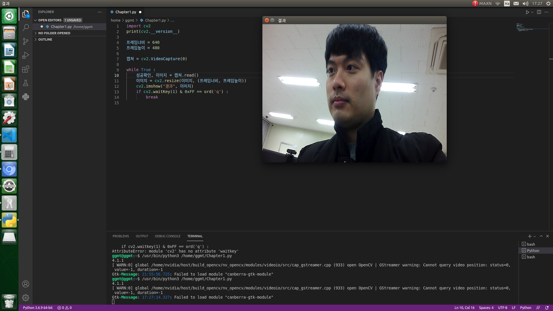 흑백이미지 = cv2.cvtColor(웹캠복사, cv2.COLOR_BGR2GRAY)