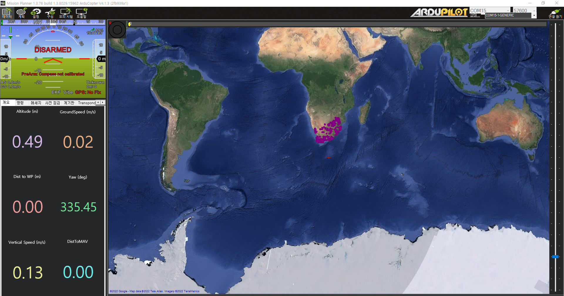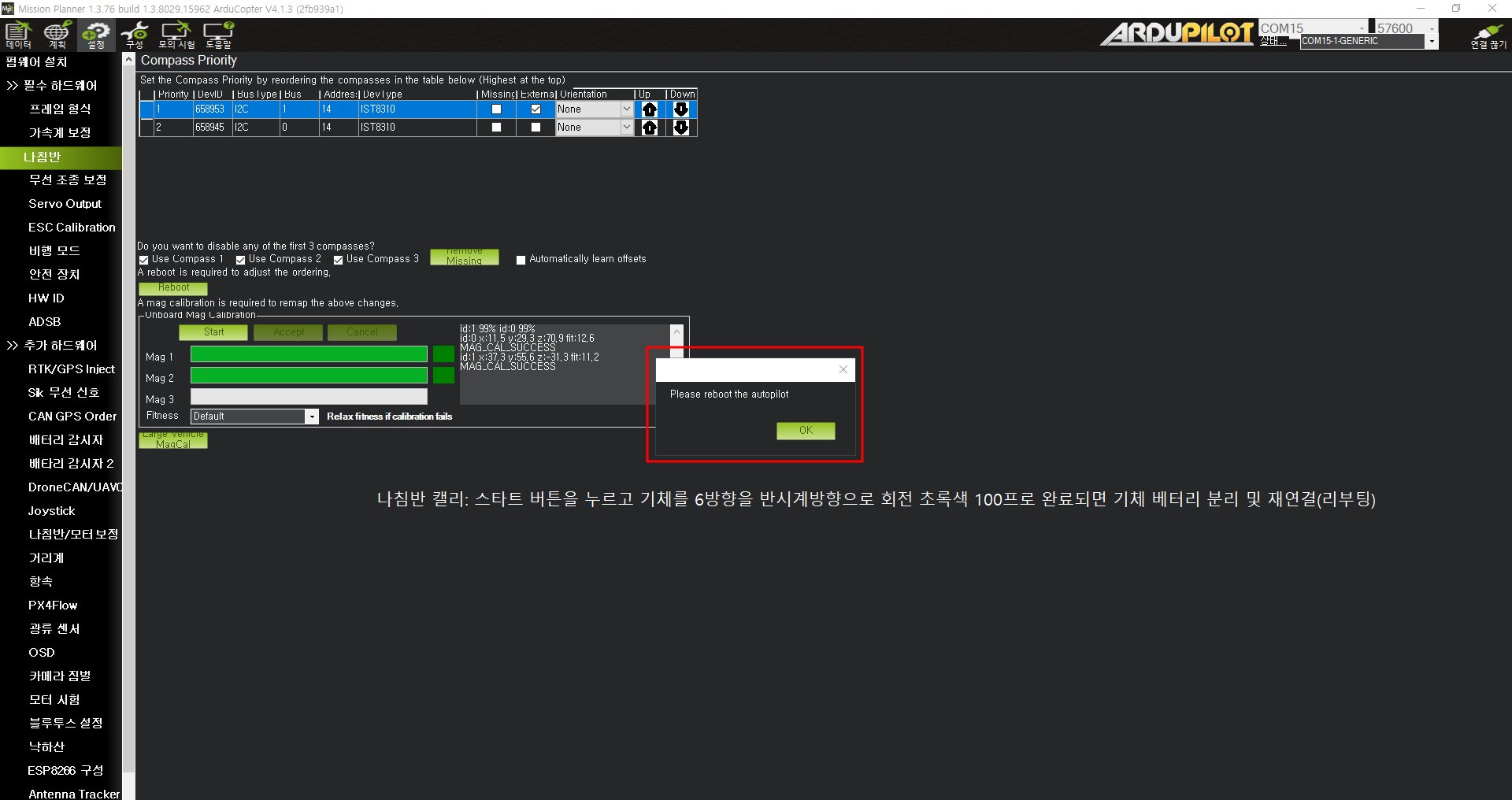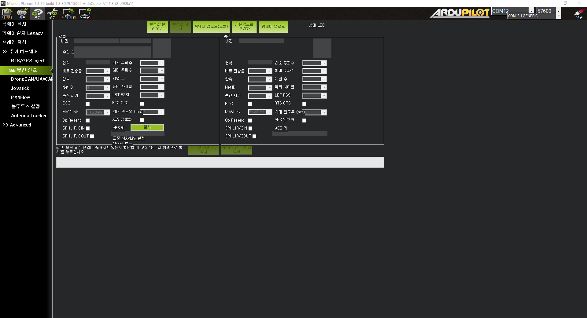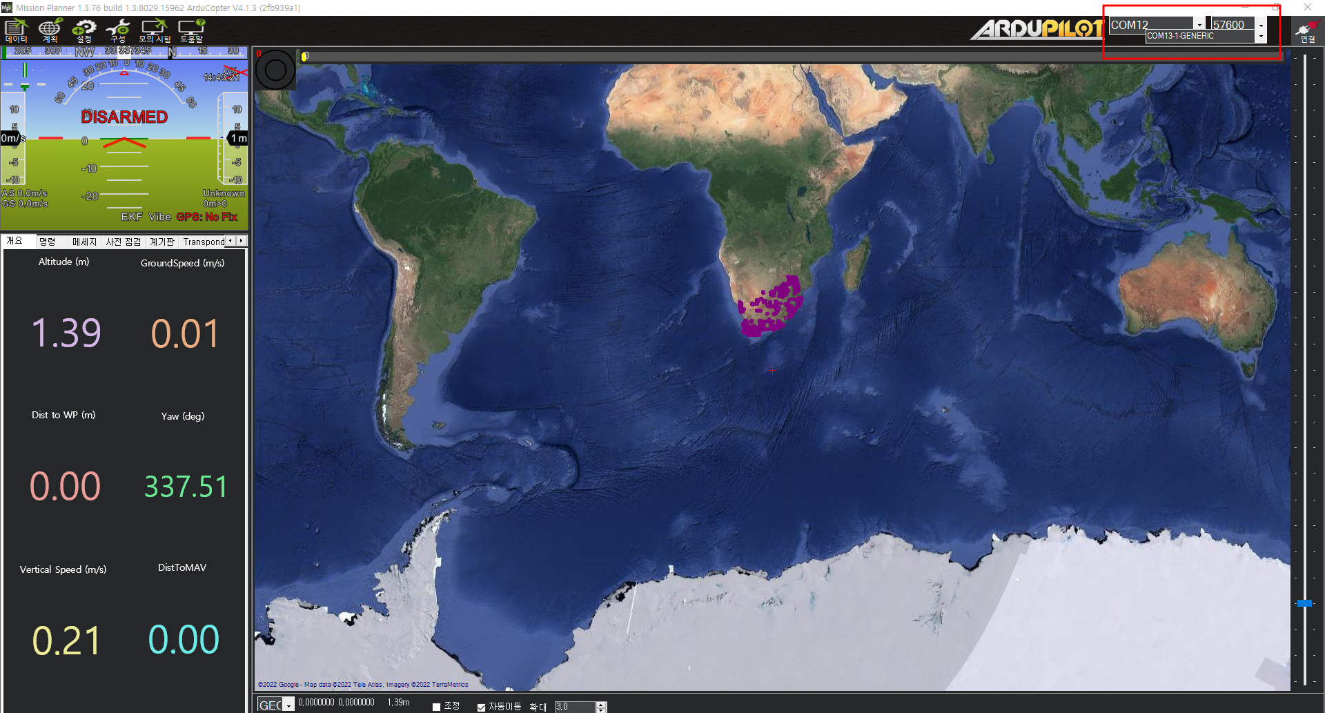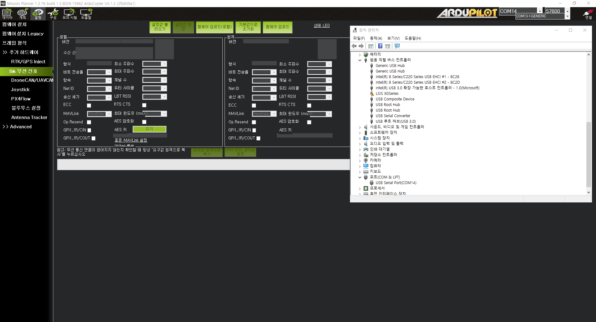 텔레메트리 com번호를 확인한 후 무선 송수신 속도(57600)으로 변경후 미션플래너에 연결한다.