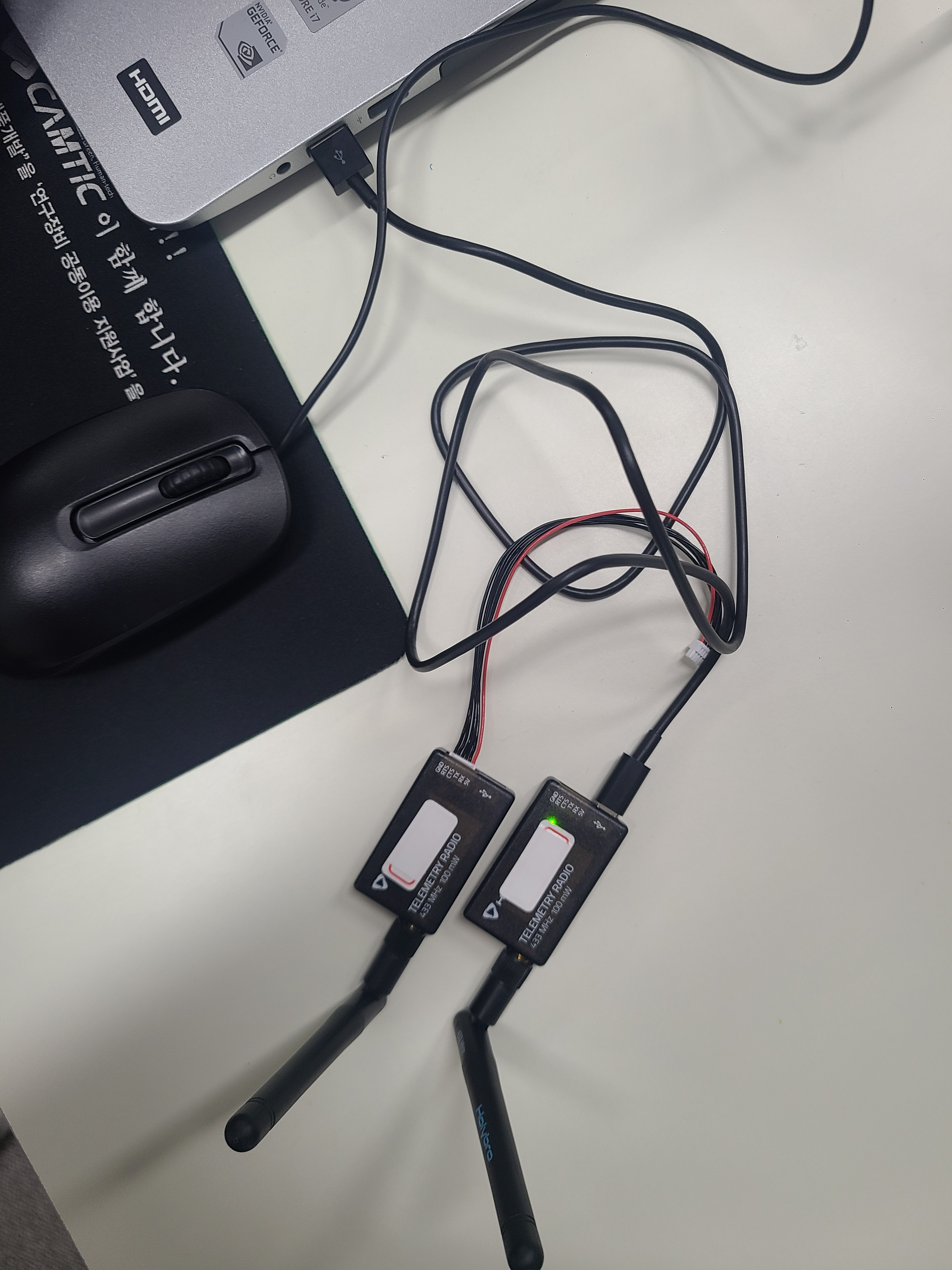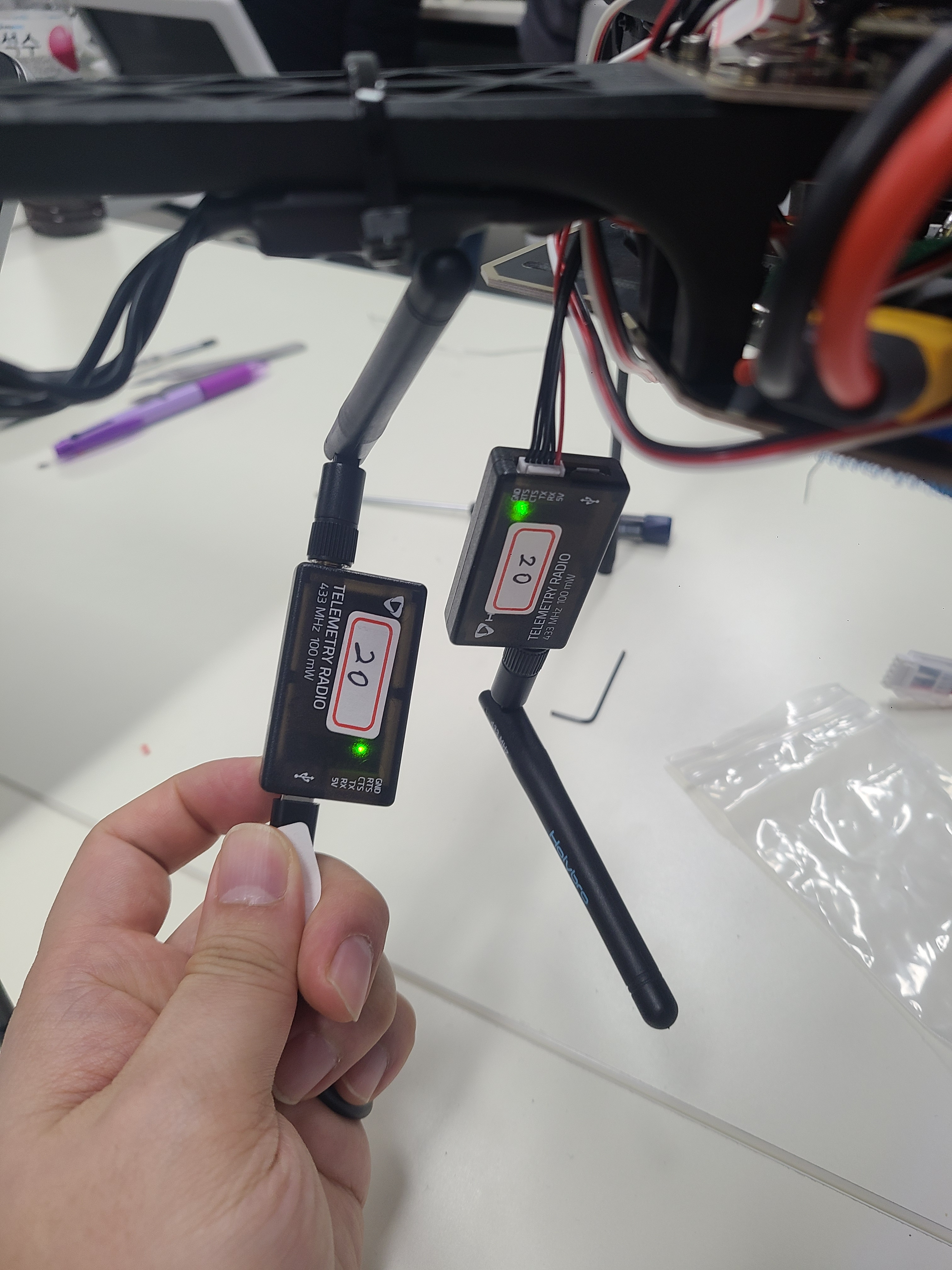 하나는 PC에 달고, 하나는 픽스호크에 달것이다. 하지만 달기 전에 두개의 텔레메트리 모두 net id를 부여 해야 한다. 넷 아이디 기재하기 위해 견출지를 붙여 놓는다.