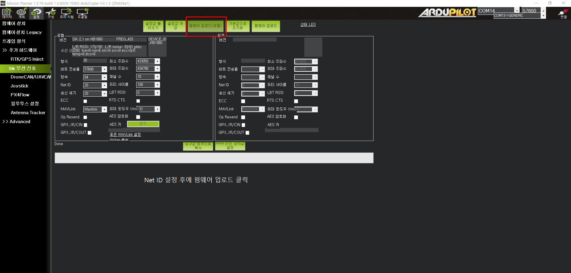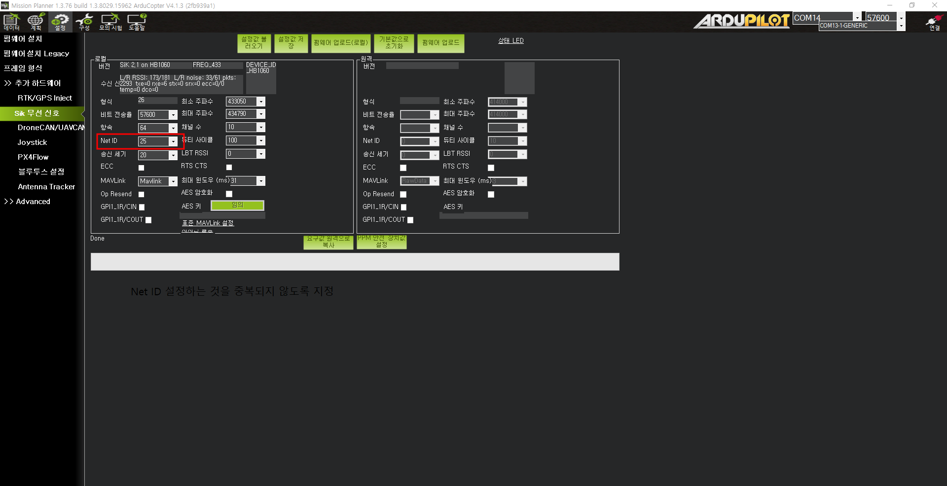 3) 설정값 불러오기를 눌러 Net ID를 확인한다.(텔레메트리는 처음 상태에서 둘이 페어링이 되어있지만, 원하는 Net ID로 변경이 가능하다)