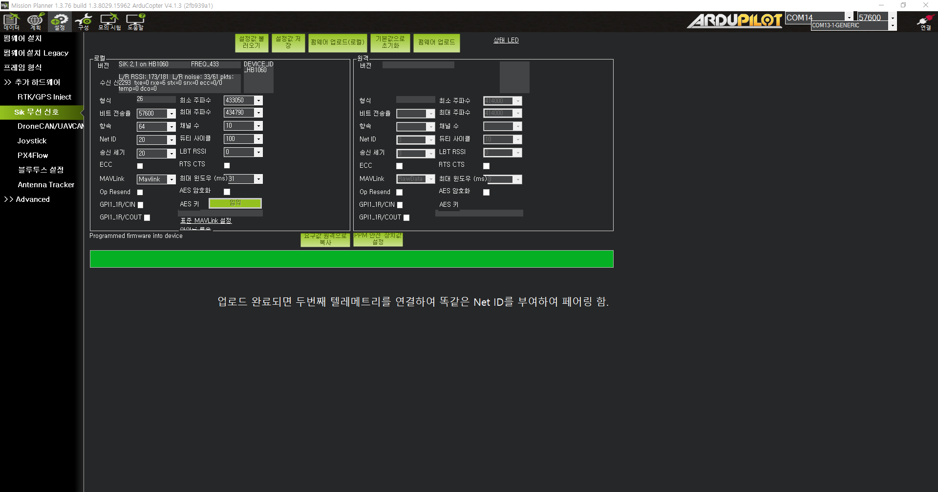 2개의 텔레메트리 모두 미션플래너로 넷아이디를 부여 받아야 한다. 먼저 하나를 연결한다.