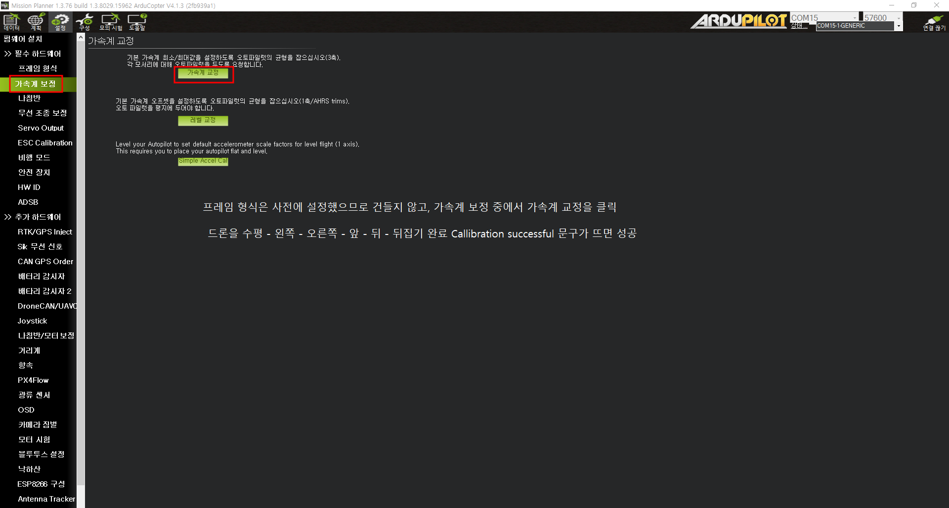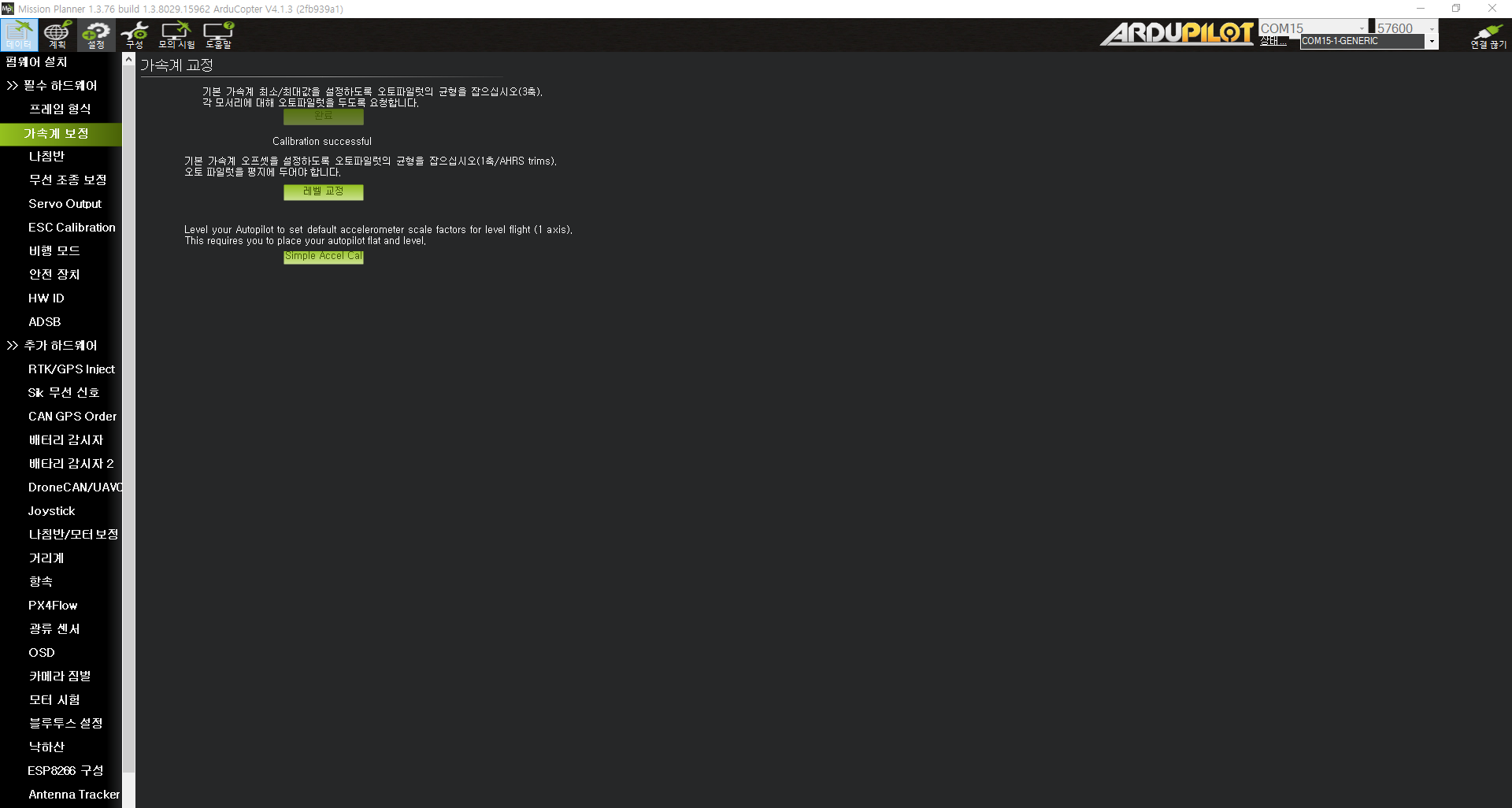 2) 텔레메트리 통신속도는 57600으로 설정한다.