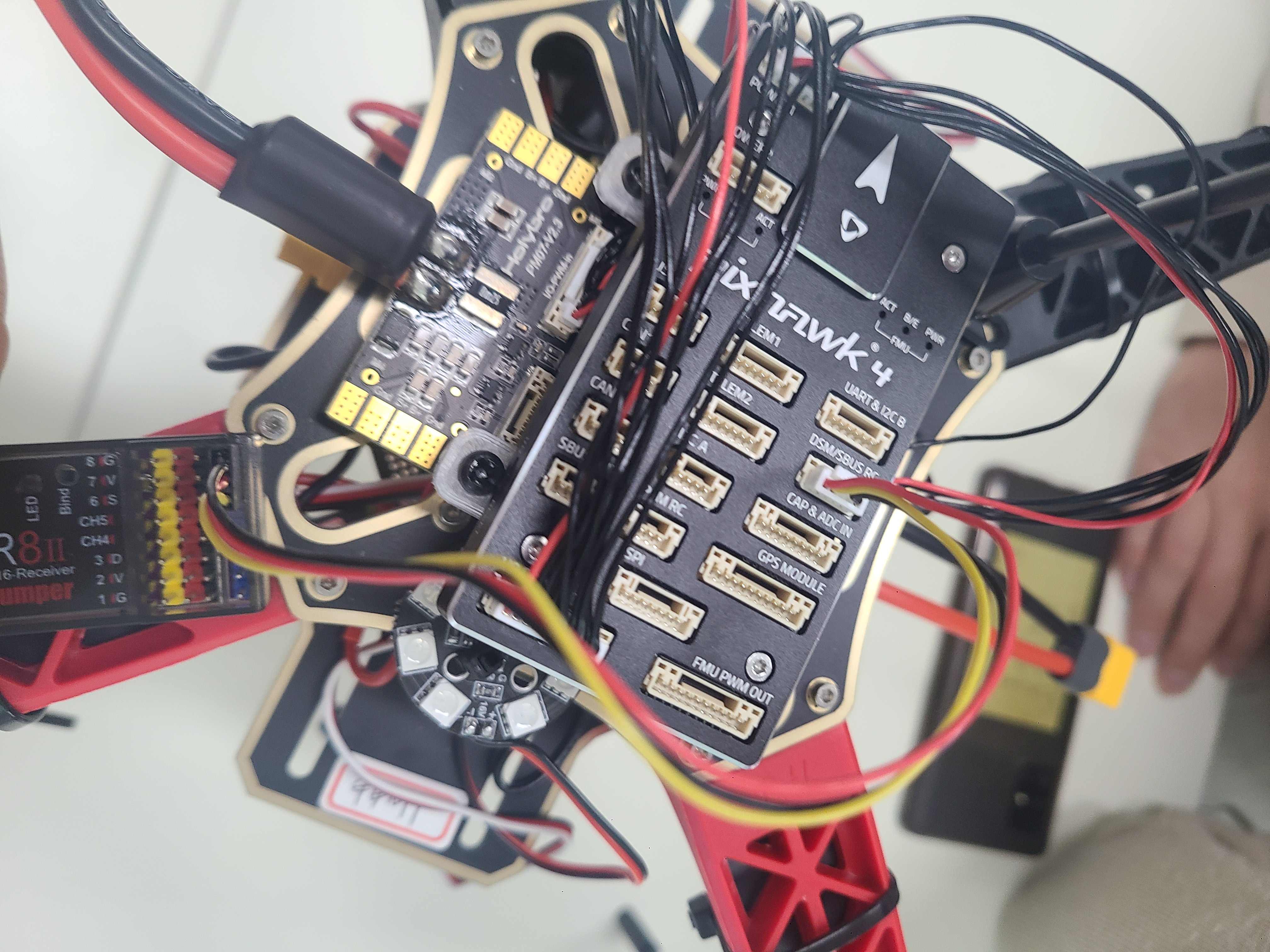tx/rx 선이 하나로 묶여 있음을 볼수 있다. 따라서 픽스호크의 telem2의 rx, tx의 2개의 선이 r8 수신기에서는 하나의 선으로 묶여야 한다.