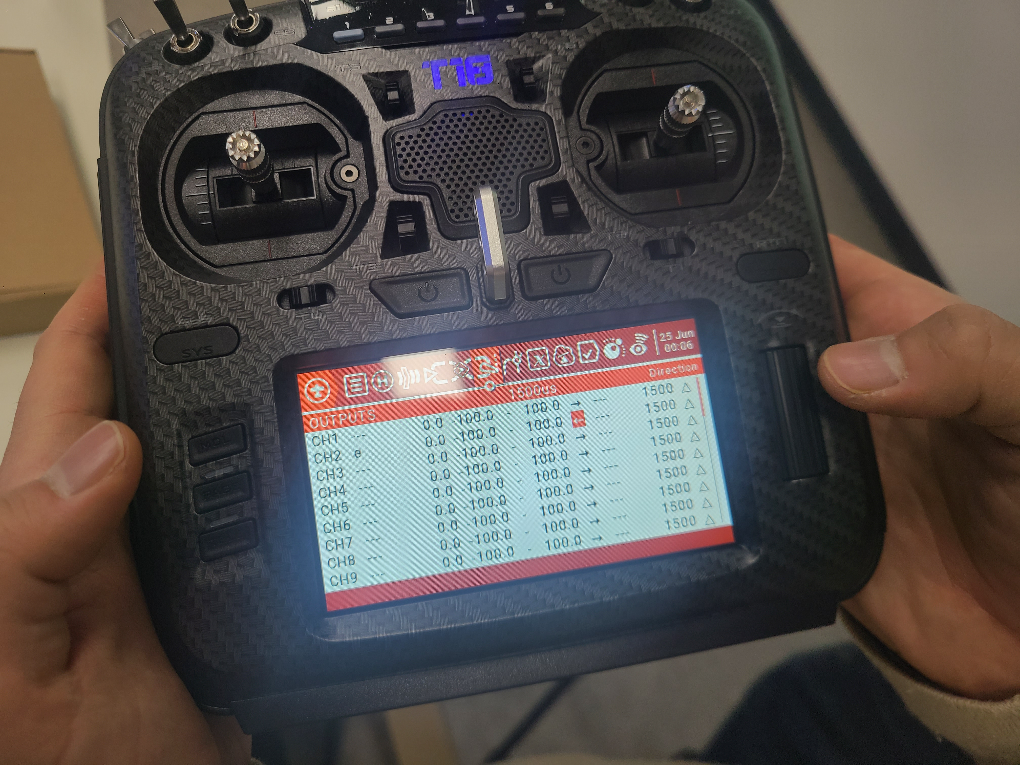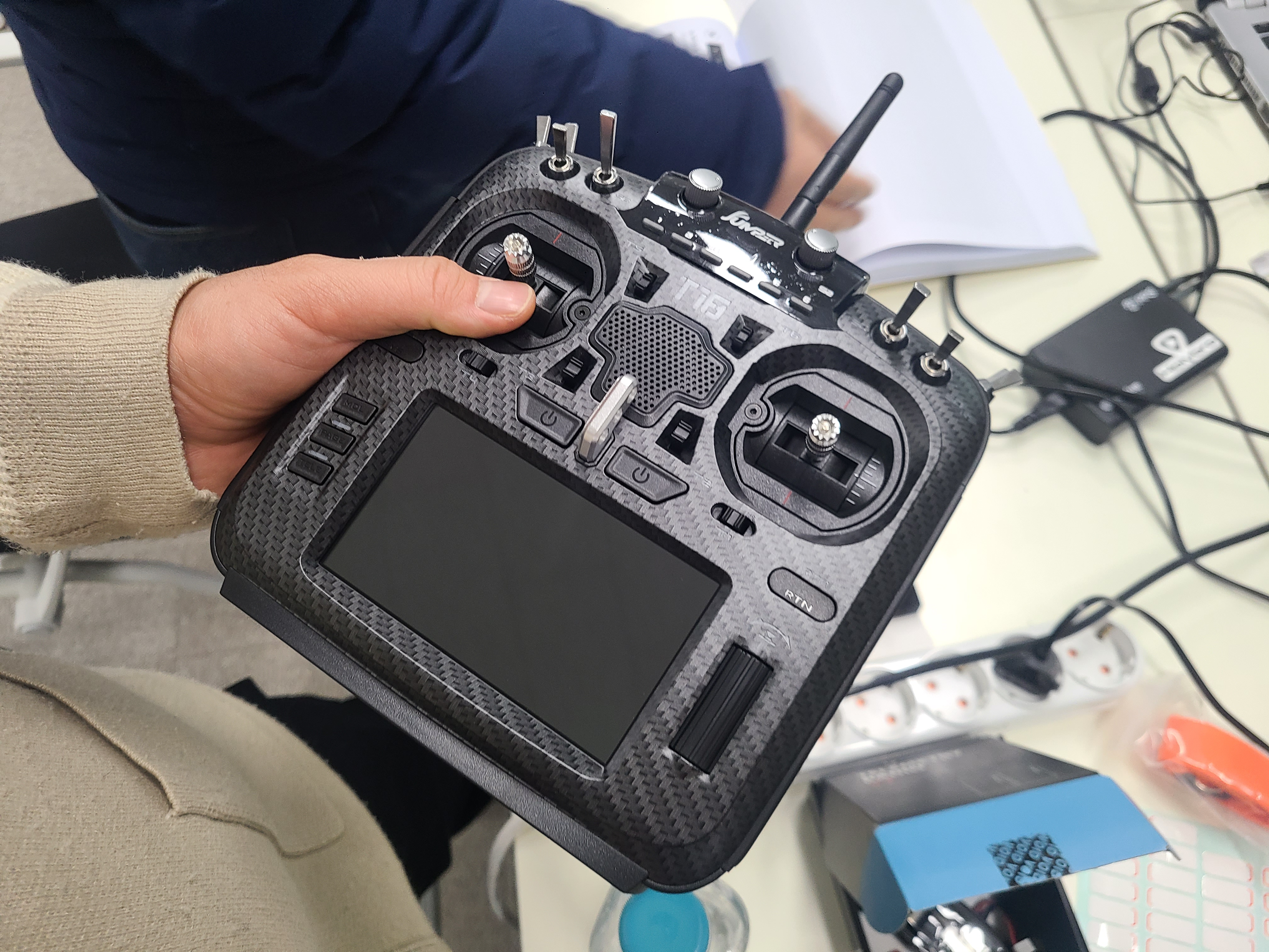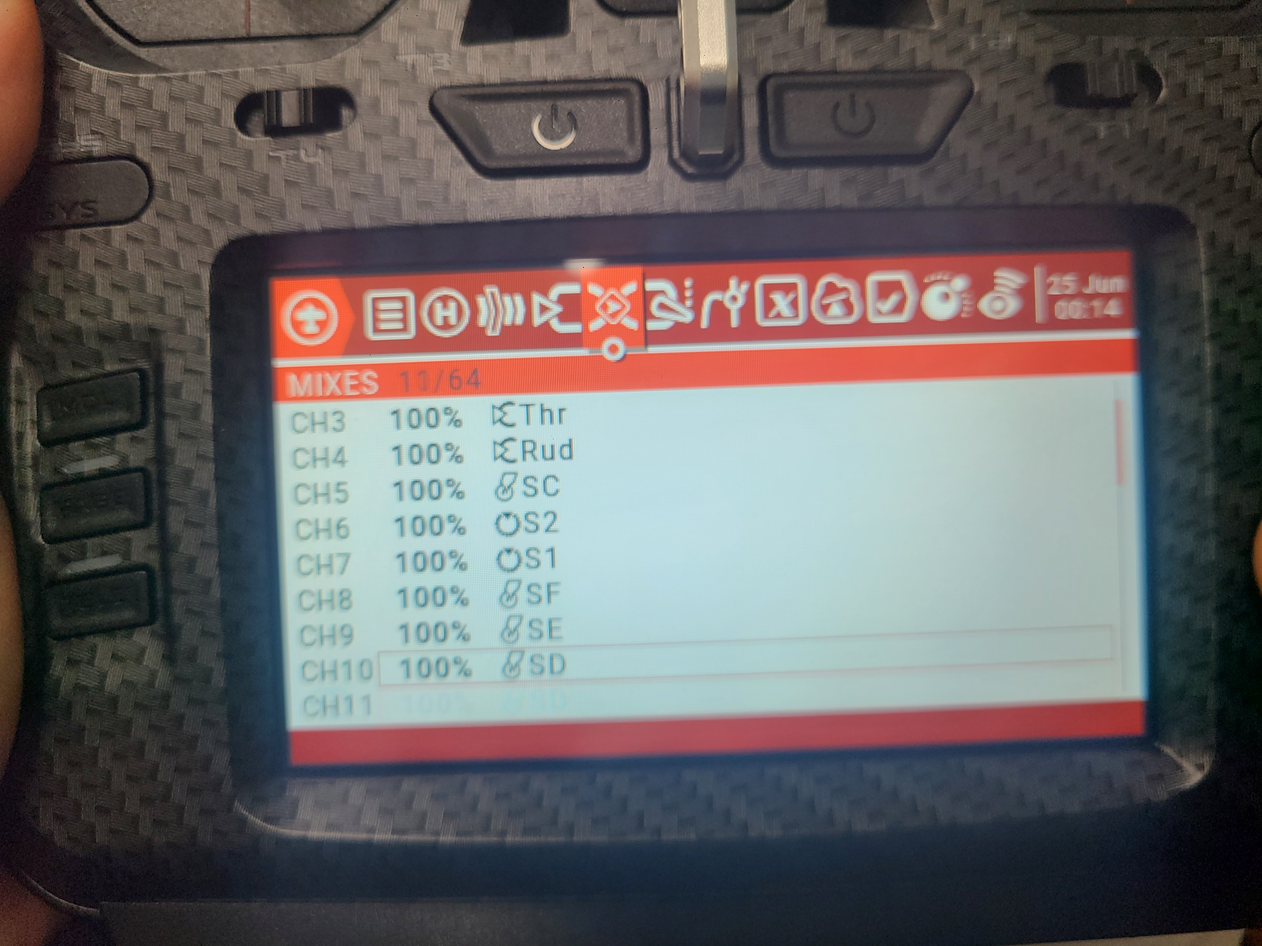 조종기를 켜준다. 처음에 조종기를 킬때는 위의 기다란 토글 스위치 들이 모두 밖방향으로 되어야 디폴트 세팅이고, 쓰로틑을 한번 움직여 주어야 초기 화면으로 들어간다.