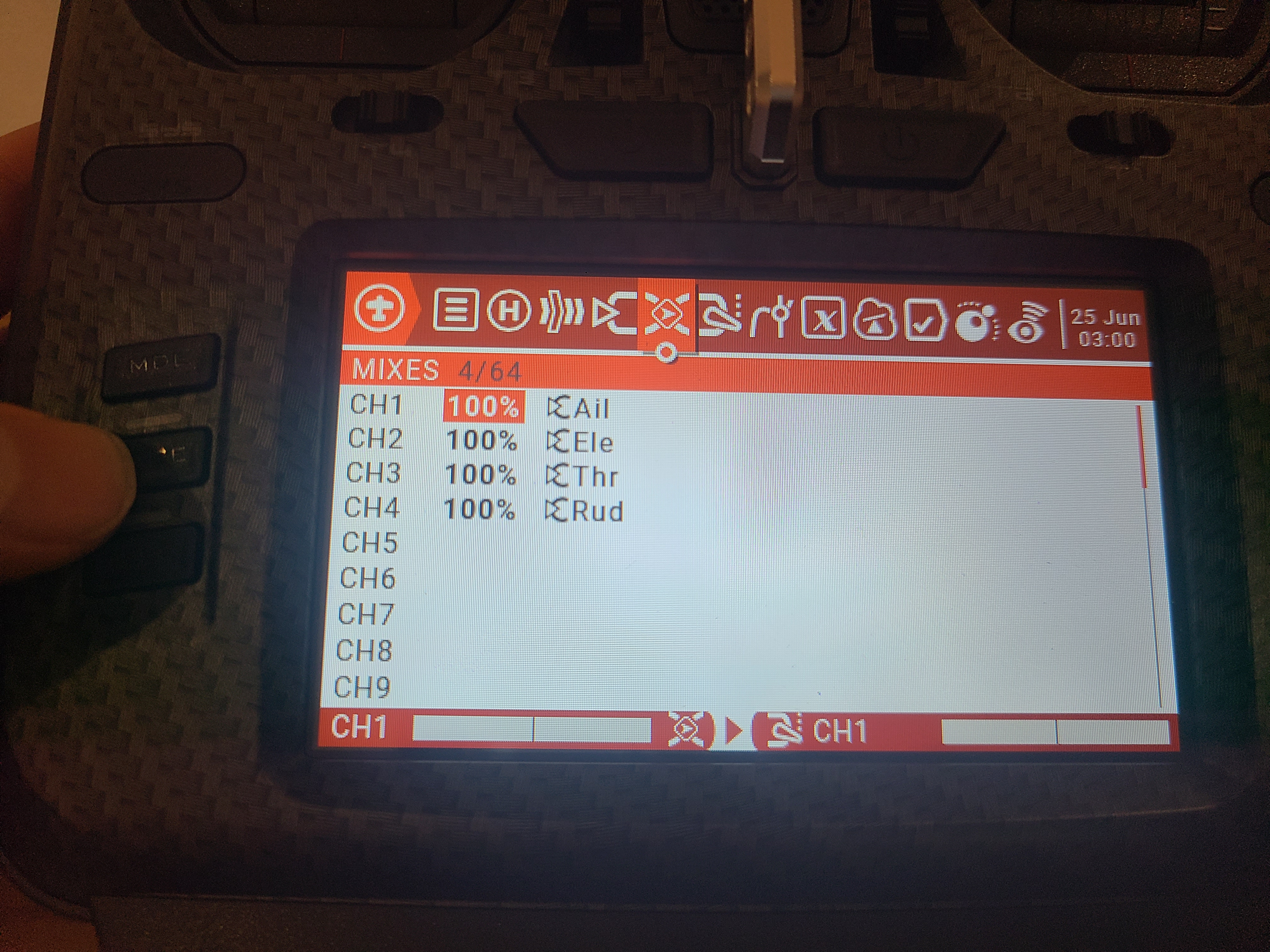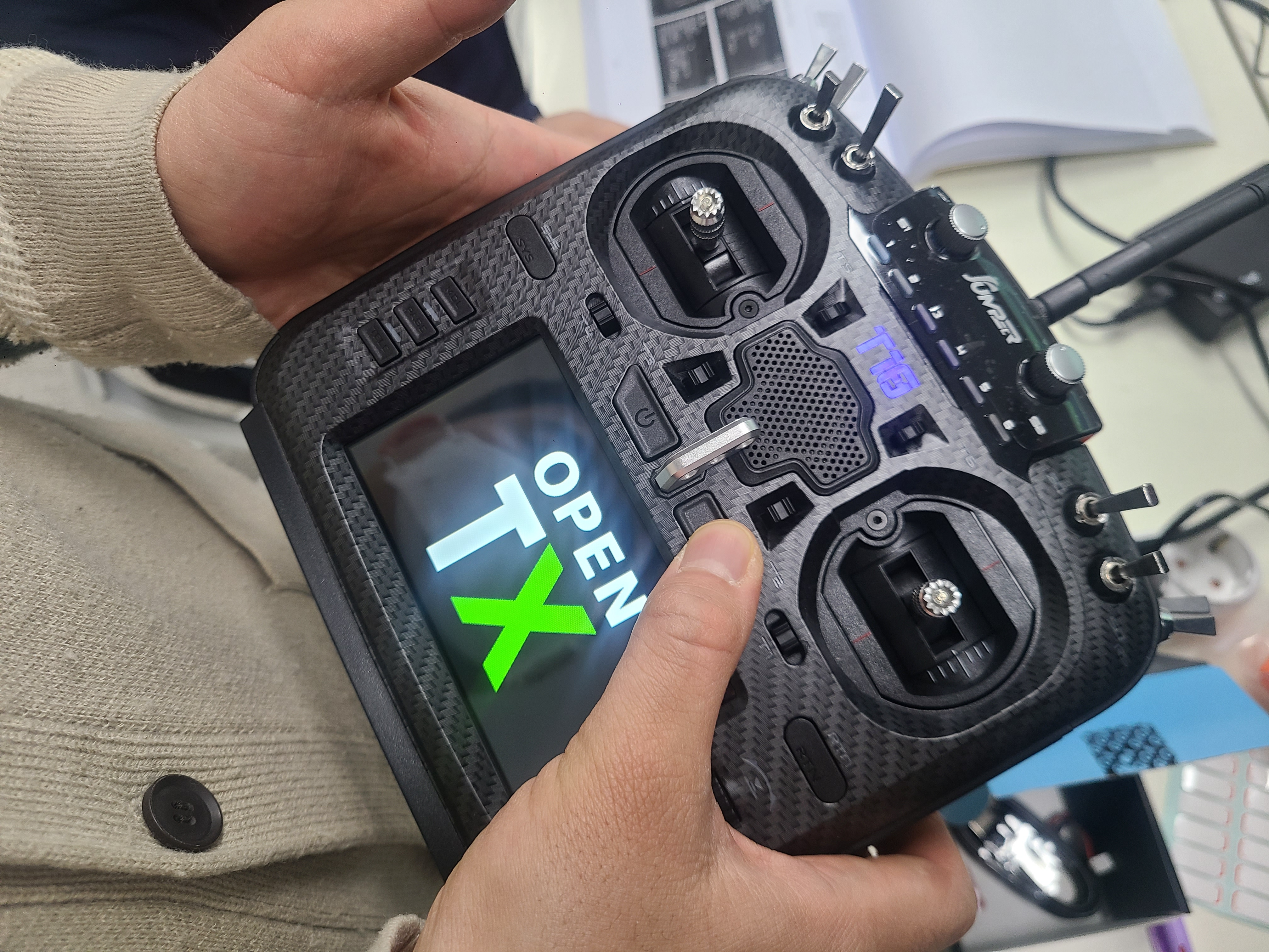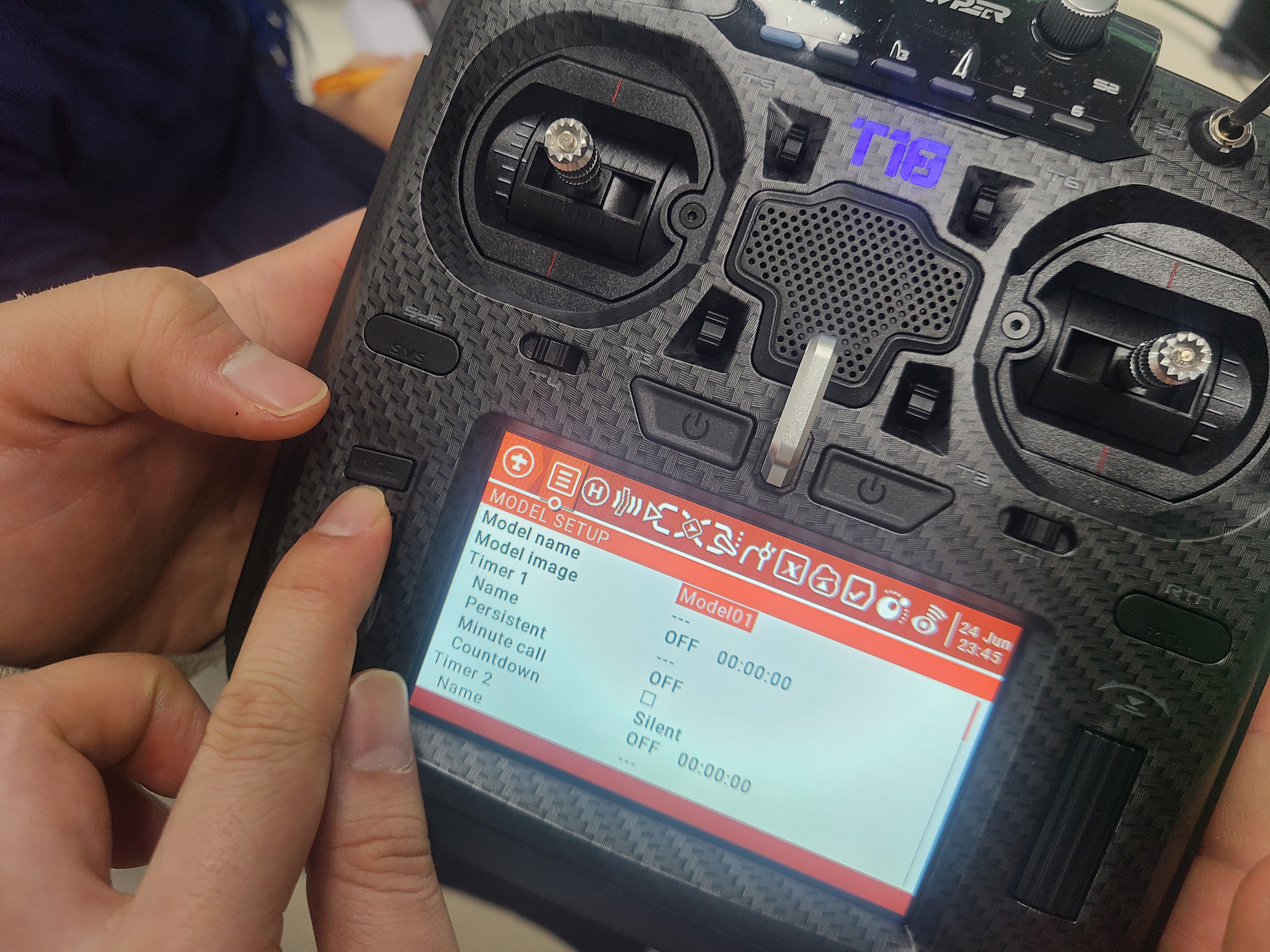 조종기를 켜준다. 처음에 조종기를 킬때는 위의 기다란 토글 스위치 들이 모두 밖방향으로 되어야 디폴트 세팅이고, 쓰로틑을 한번 움직여 주어야 초기 화면으로 들어간다.