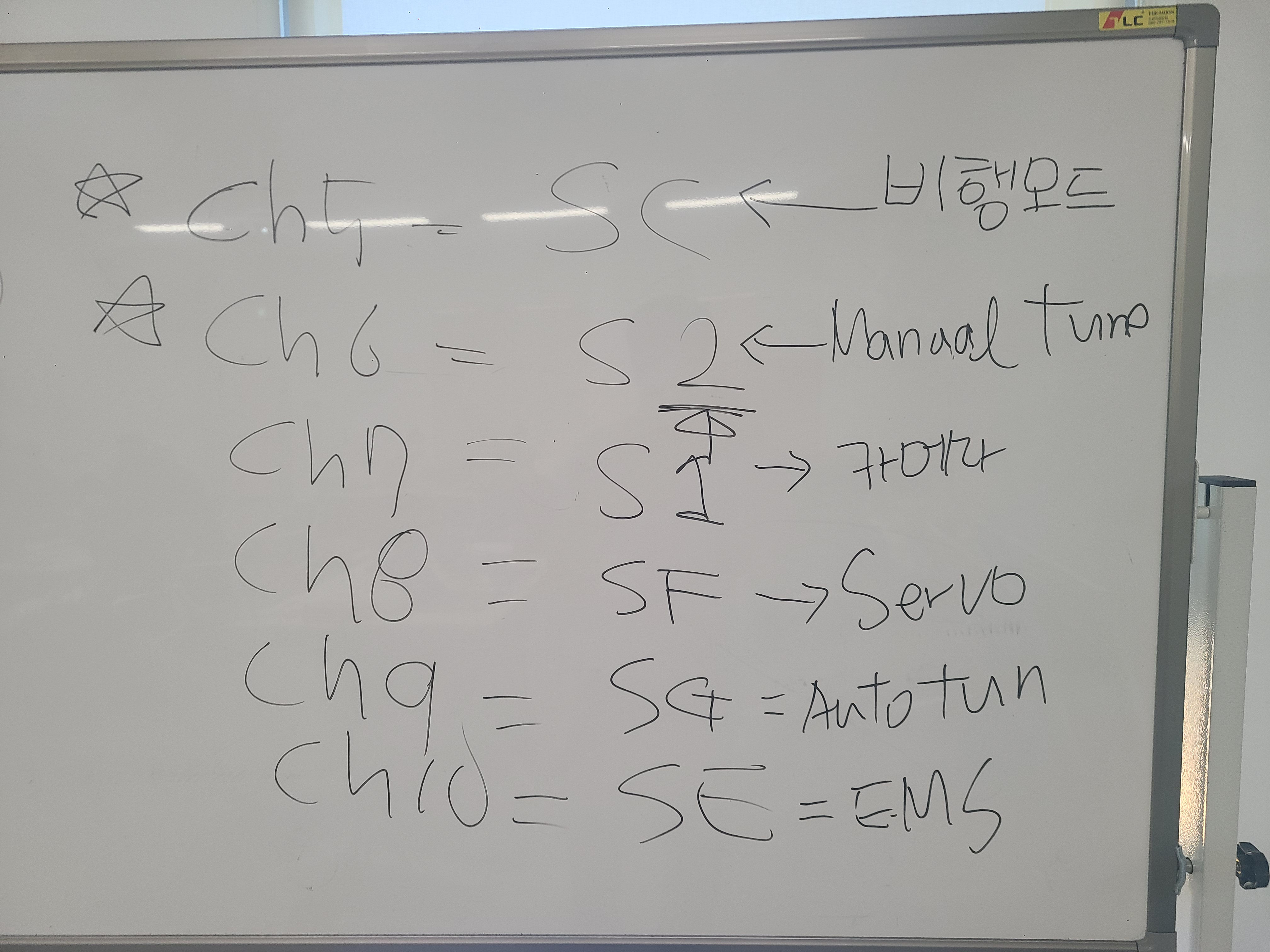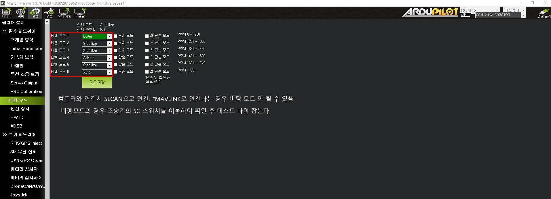 비행 모드를 설정한다. 비행모드는 위와 같이 세팅해준다. 이후 조종기의 SC 토글 스위치로 로이터-알트홀드-오토 모드를 왔다갔다 하기 위함.