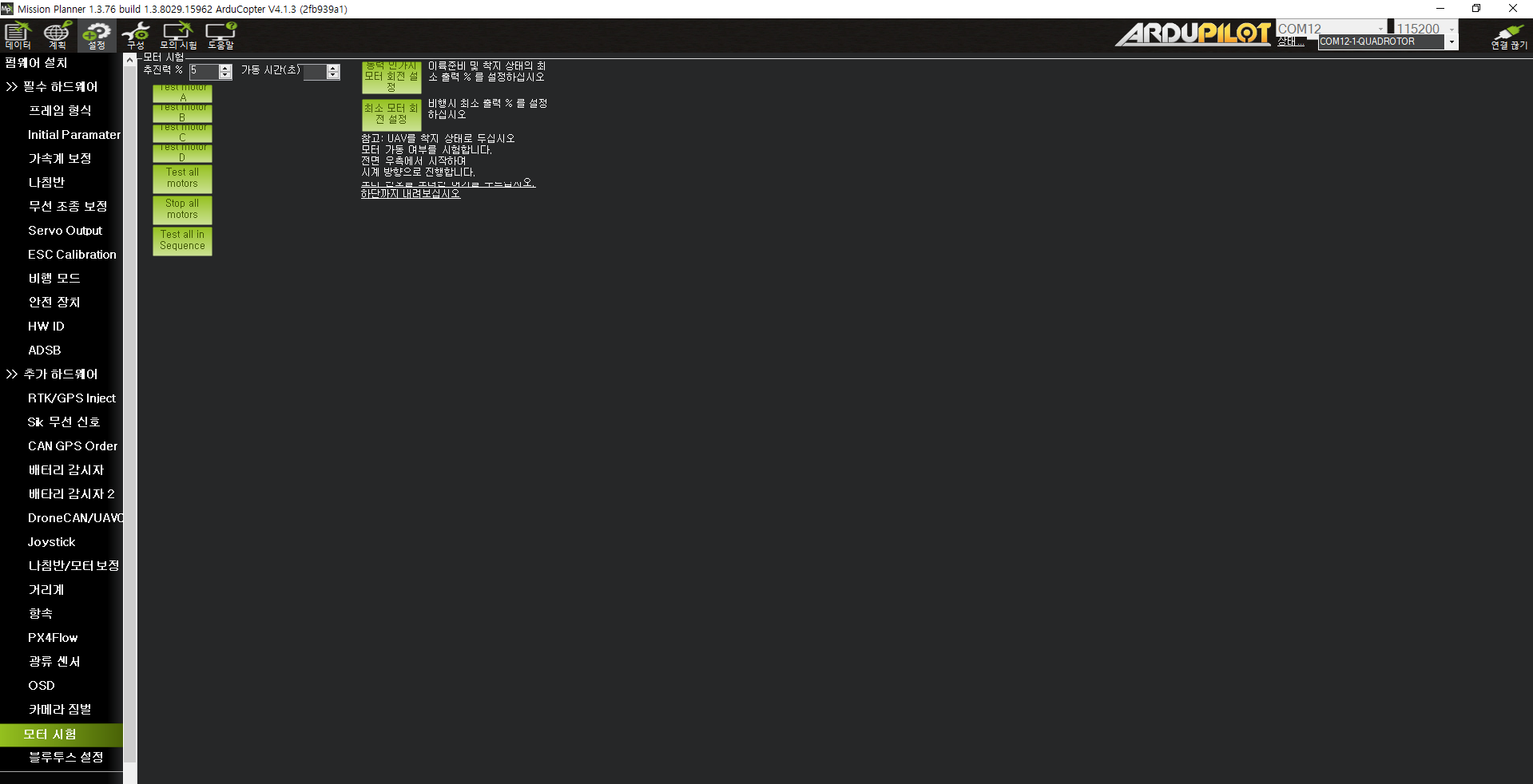 모터 테스트는 4개의 모터가 CW, CCW 방향으로 정삭적으로 도는지 확인하기 위함이다.(esc 캘리가 선행되어야 한다.)
