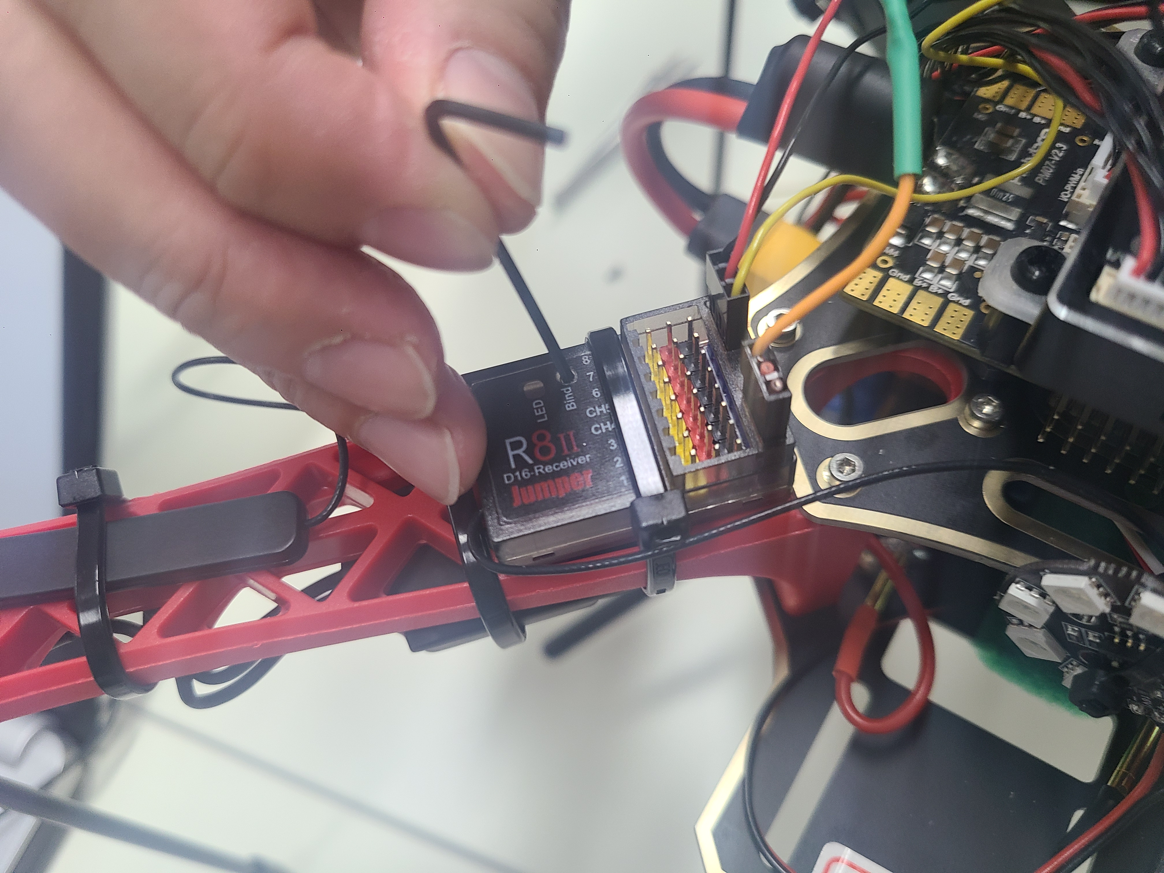 바인딩은 조종기의 세팅의 바인드 버튼을 누른뒤, 기체의 수신기 바인딩 버튼(핀셋등을 사용)을 누르며 기체를 켜주면 된다.