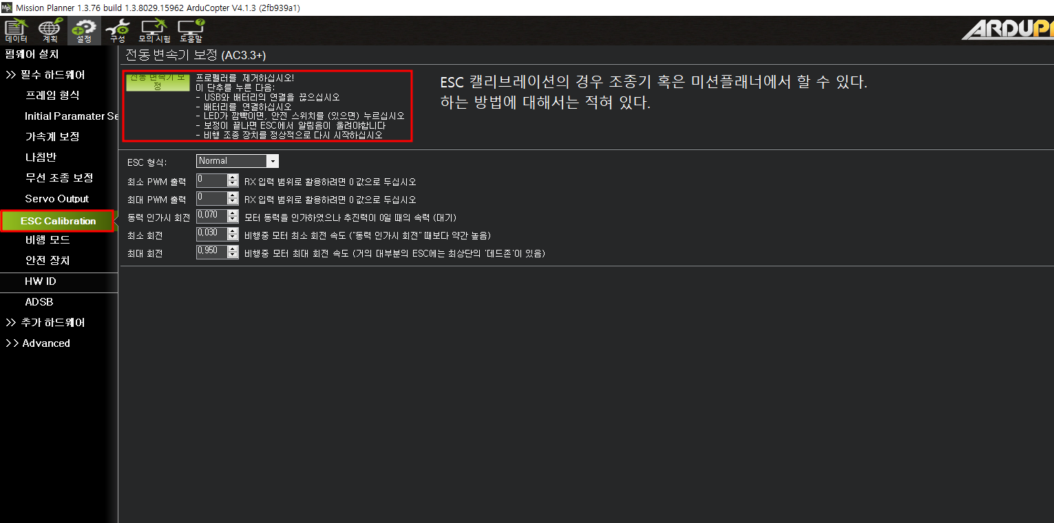 esc 캘리브레이션은 필자가 가장 고생했던 작업이었다. 위 스크린샷 처럼 미션플래너에서 캘리브레이션이 가능하지만