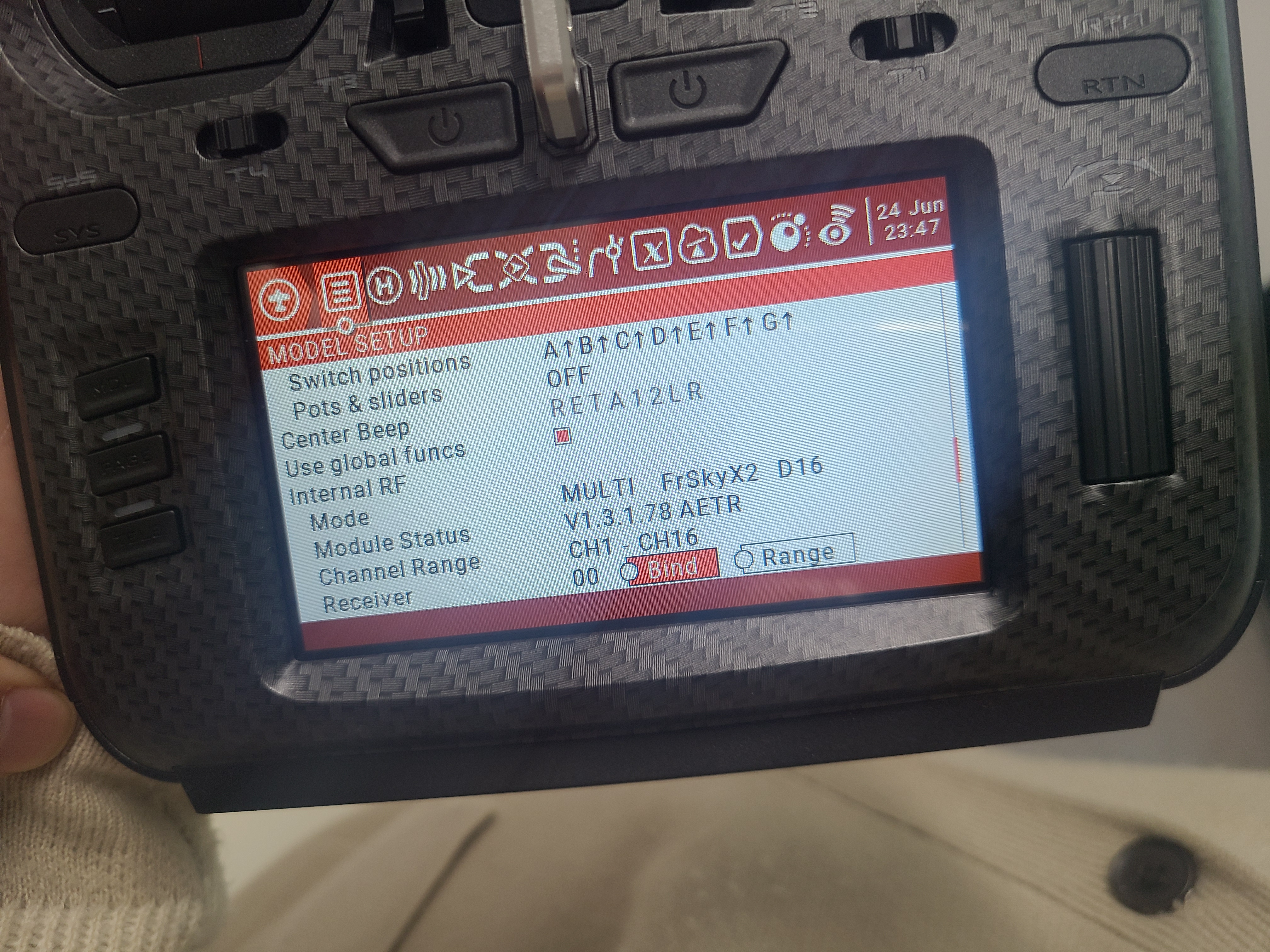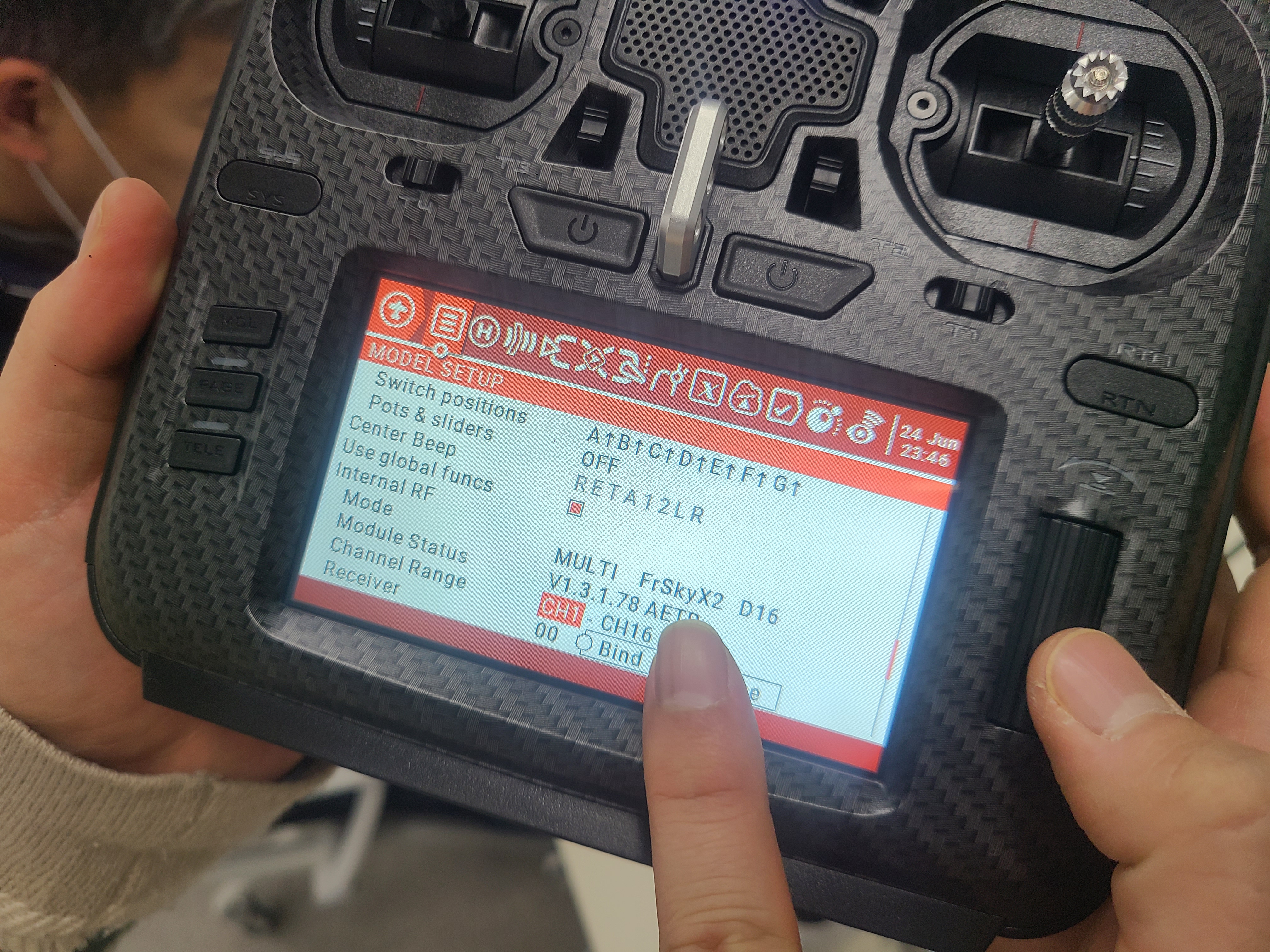 오른쪽 휠을 눌러 Mode로 가 아래 처럼 MULTI FrSKYX2 D16로 세팅을 해준다.