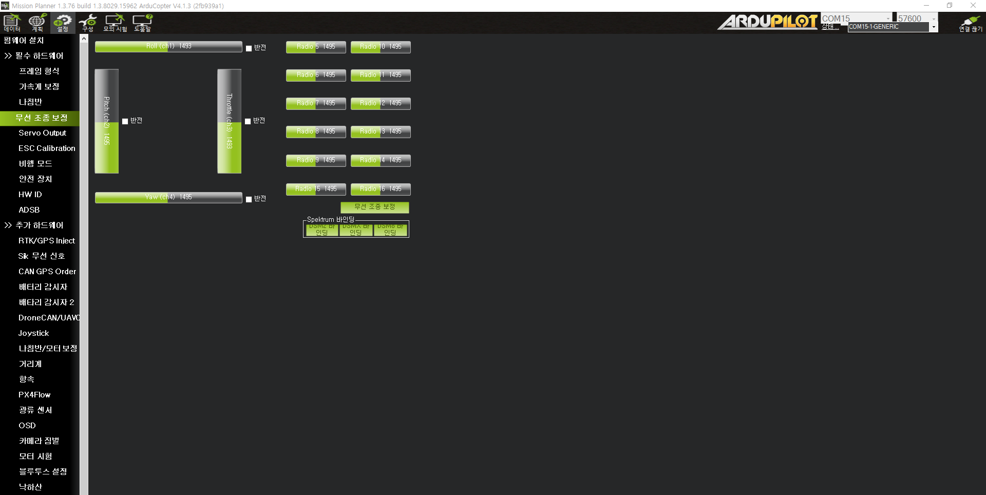 미션플래너 세팅으로 가서 무선 조종 보정을 들어간다.