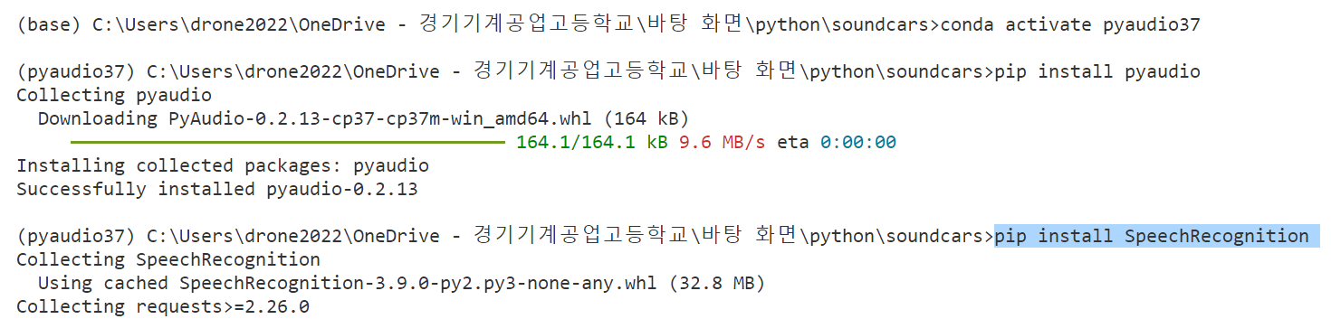 VSCODE 터미널 가상환경(python3.6버전 및 pyaudio 패키지 설치) 생성 명령어