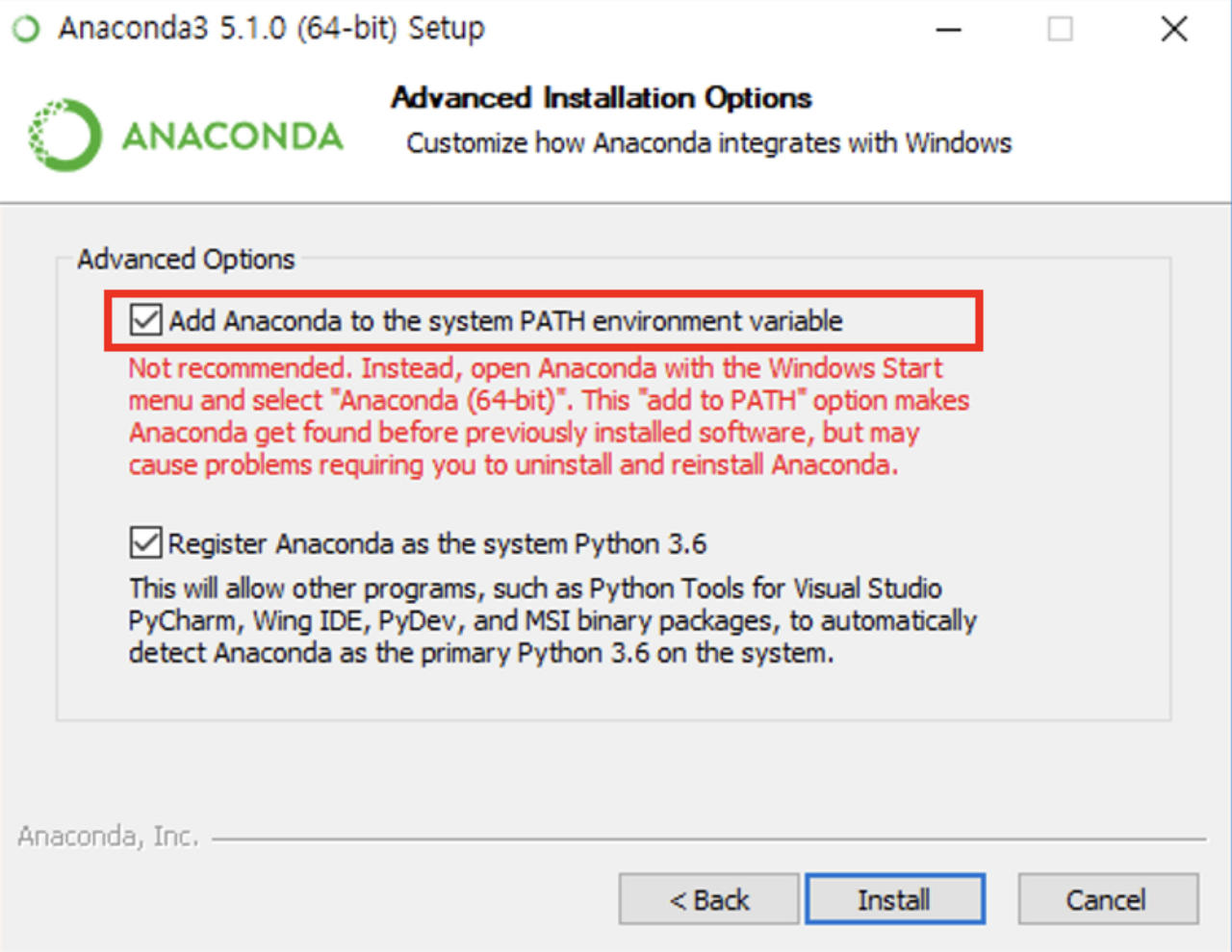 주의) 설치시 PATH enviroment variable에 꼭 클릭을 해주어야 한다. (그냥 다음 계속 누르기 금지)