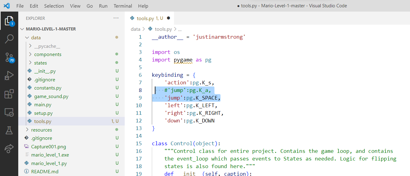 이때, 마리오 게임에서는 a가 점프인데, 위 컨트롤러 코드에서는 space 값을 반환하기 때문에 이 두개를 호환하기 위하여 코드를 수정해 주었다.