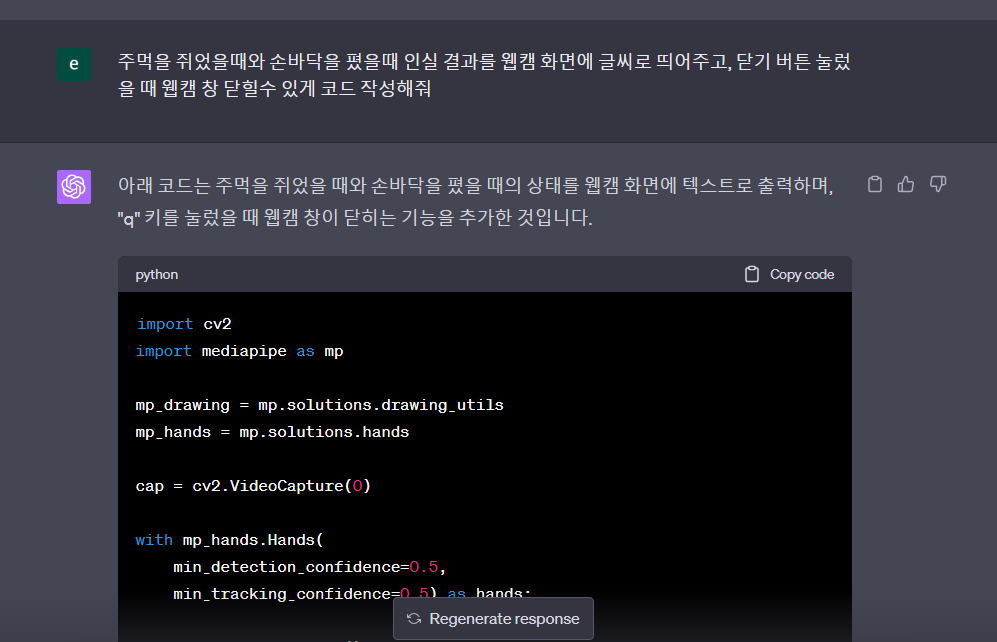 GPT가 엄지손가락 위치 기준으로 손바닥, 주먹 여부를 구분하는 코드를 작성했기 때문에 원하는 동작은 아니였지만 동작 방식을 확인하기에는 충분한 코드였다.