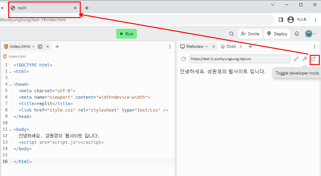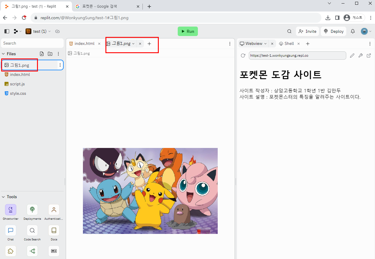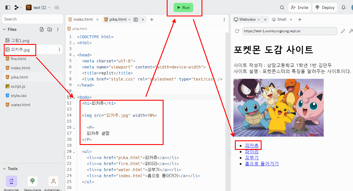 코드를 작성한다. 그리고 Run버튼을 누르고 그림이 웹사이트에 잘 들어갔는지 확인한다.