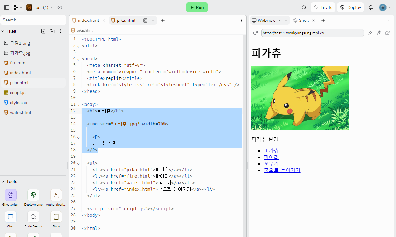 pika.html 코드를 복사 붙여 넣기 하여, fire.html, water.html의 파이리와 꼬북이 내용도 변경해 준다.