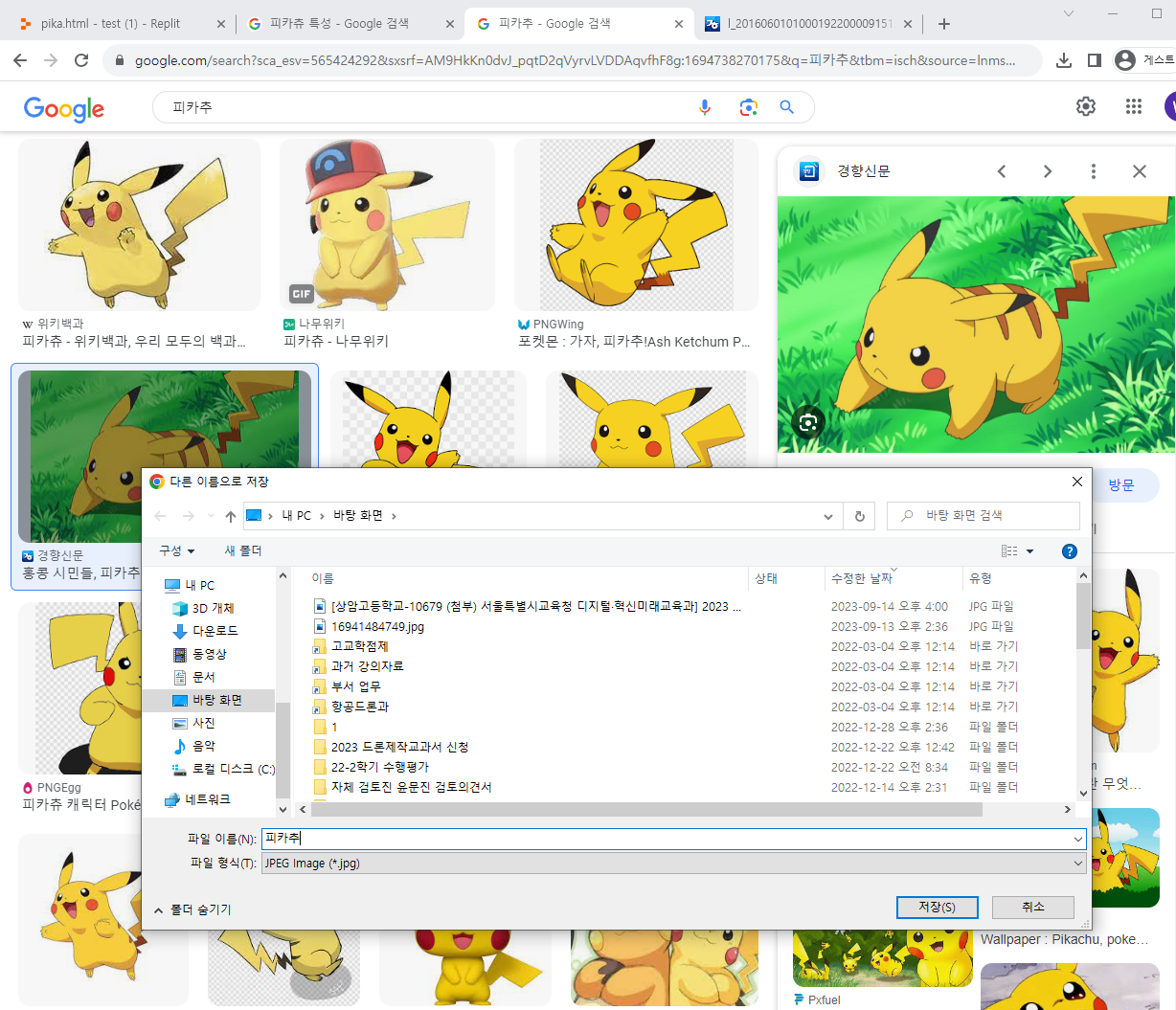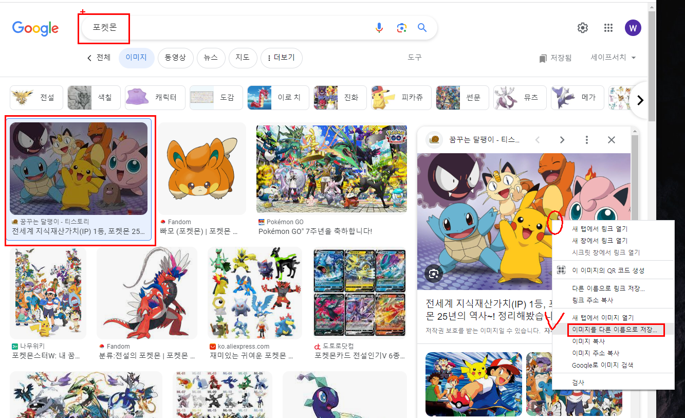 선생님은 포켓몬스터 도감 사이트를 제작해 보겠다. 우선 포켓몬 이미지를 검색하여 다른이름으로 저장하자.