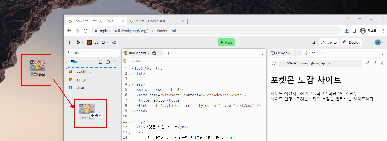 바탕화면에 있는 그림1을 드래그 해서 Replit 파일 디렉토리에 끌어다 놓는다.(Drag & Drop)